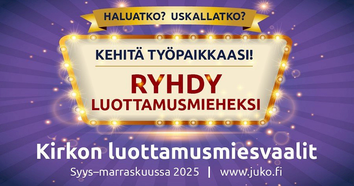 Jos sinulla ei ole vielä luottamusmiestä, ryhdy luottamusmiesehdokkaaksi tai kannusta jukolaista työkaveriasi lähtemään ehdolle ja ole rohkeasti yhteydessä vaalien järjestämisestä JUKOssa kirkon sektorin neuvottelupäällikköön Anne Mikkolaan: , 040 837 2731.